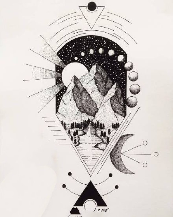 一组融合了几何和风景元素的点刺纹身手稿图案