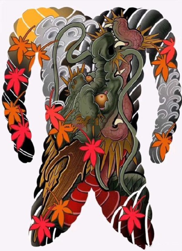 一组满背大气九龙拉棺纹身图案作品和手稿