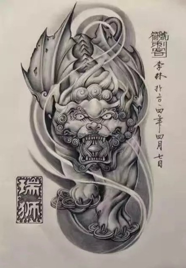 半甲唐狮手稿 传统的9款唐狮主题半甲纹身手稿图片
