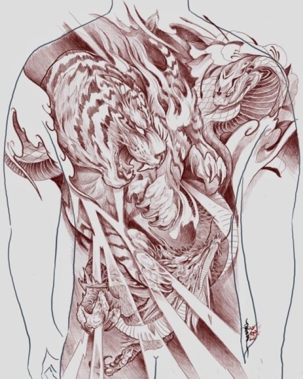 一组满背大气九龙拉棺纹身图案作品和手稿