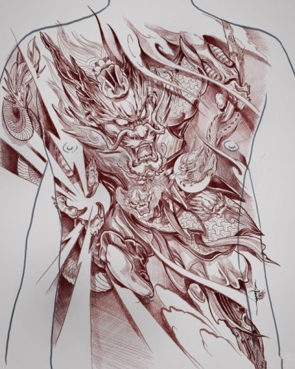 日式大板雾满背纹身手稿
