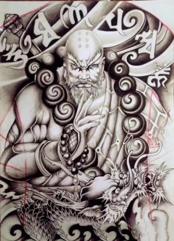 一组满背大气九龙拉棺纹身图案作品和手稿