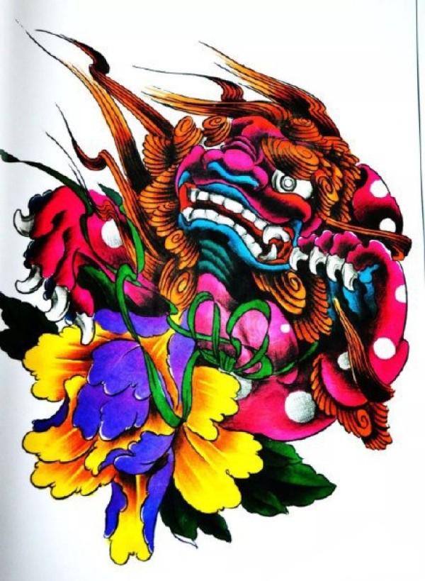 十几款彩色福狮唐狮的纹身手稿和线稿欣赏