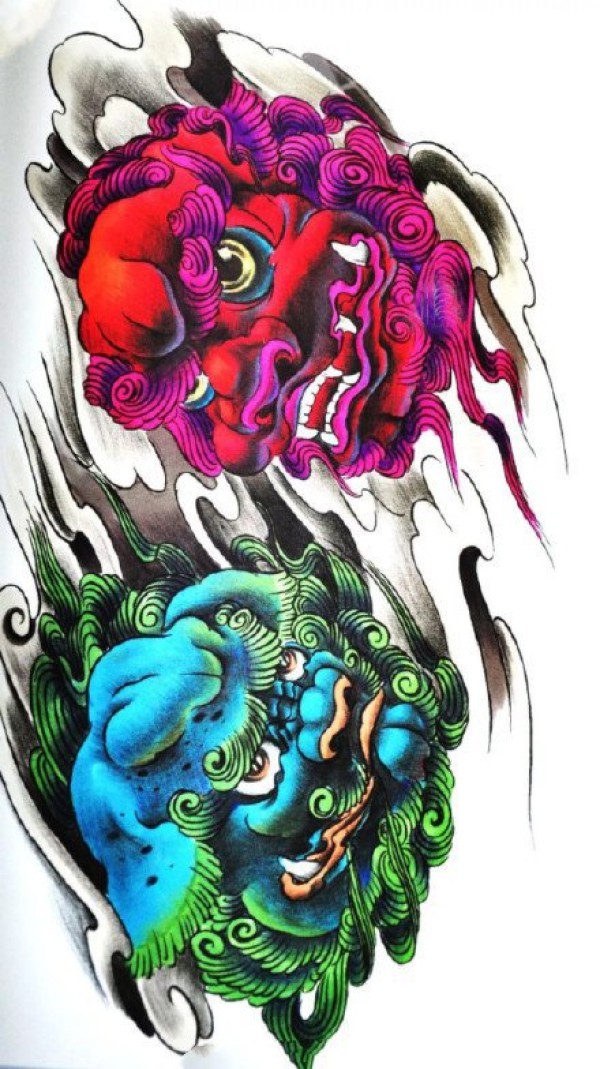 十几款彩色福狮唐狮的纹身手稿和线稿欣赏