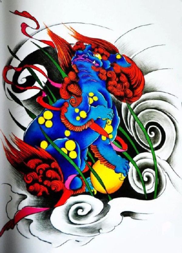 十几款彩色福狮唐狮的纹身手稿和线稿欣赏