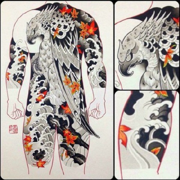 一组满背大气九龙拉棺纹身图案作品和手稿