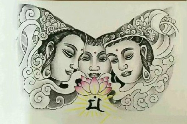 适合花胸的胸前三面佛纹身手稿图片
