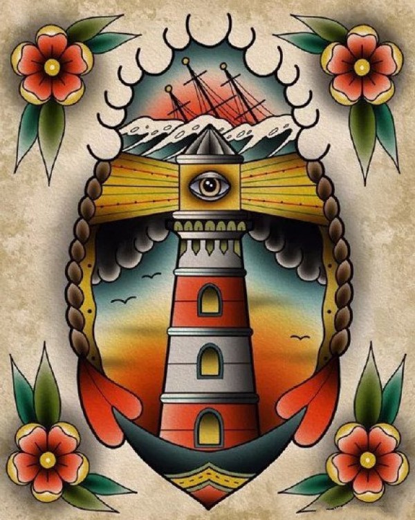 航海主题的一组school帆船灯塔船锚纹身手稿