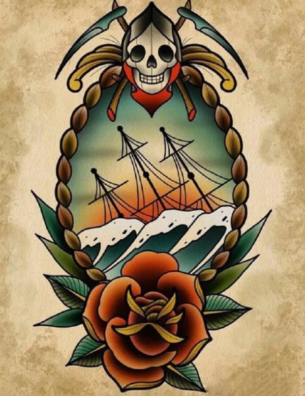 航海主题的一组school帆船灯塔船锚纹身手稿