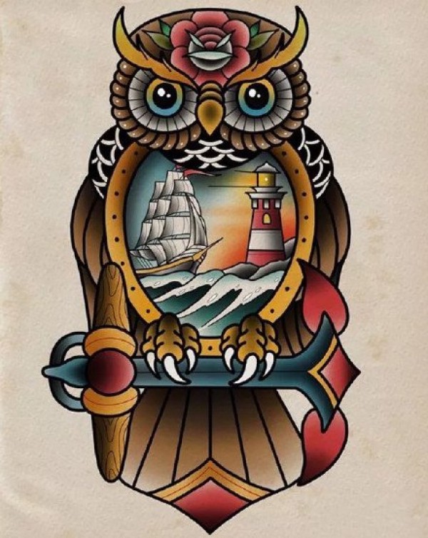 航海主题的一组school帆船灯塔船锚纹身手稿