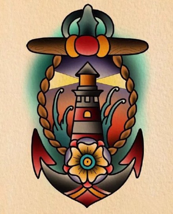 航海主题的一组school帆船灯塔船锚纹身手稿