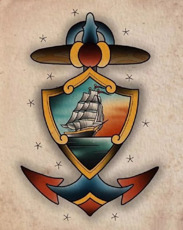 航海主题的一组school帆船灯塔船锚纹身手稿