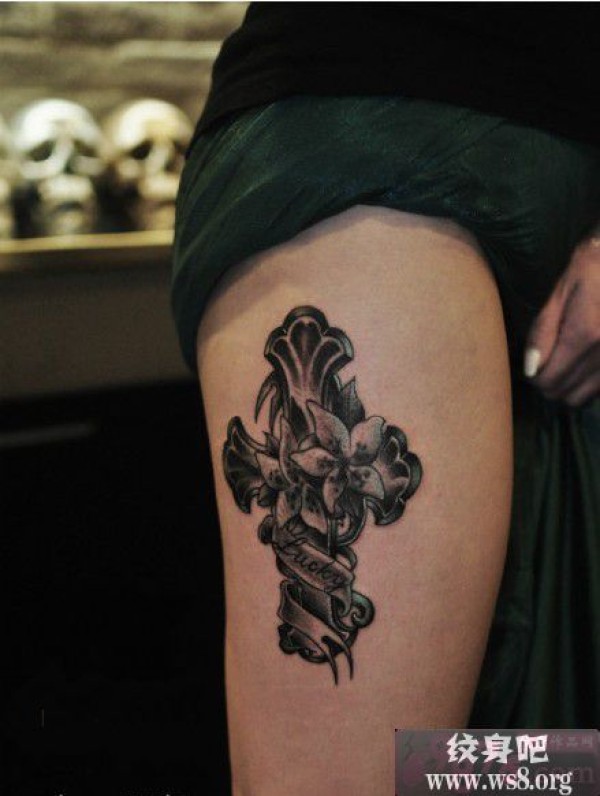 欧美花藤十字架大腿刺青图案_十字架纹身图案大全_纹身图吧