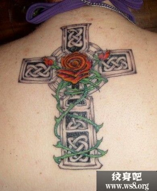 后背上十字架玫瑰图刺青图案_十字架纹身图案大全_纹身图吧