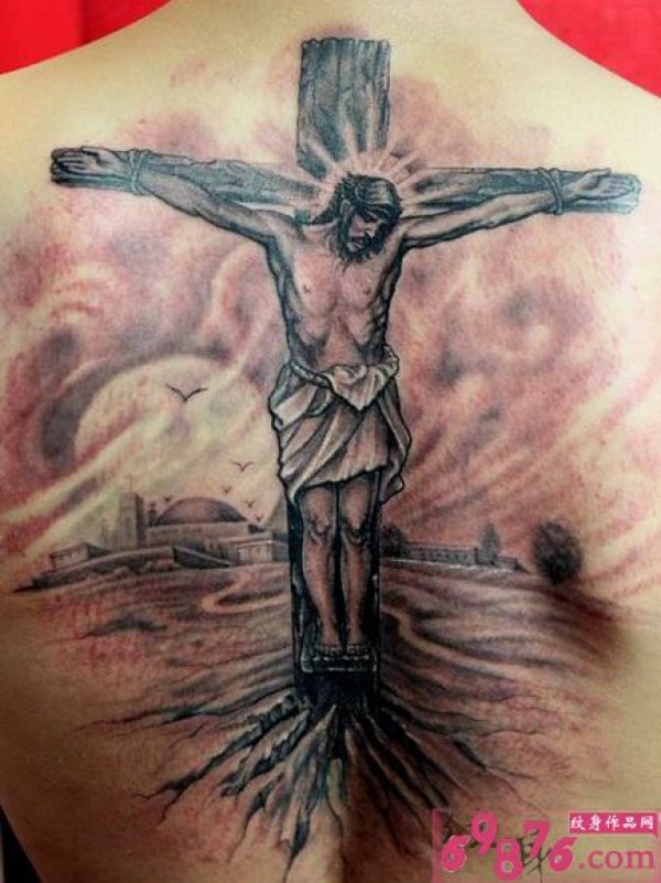 背部一款十字架耶稣纹身图案_十字架纹身图案大全_纹身图吧