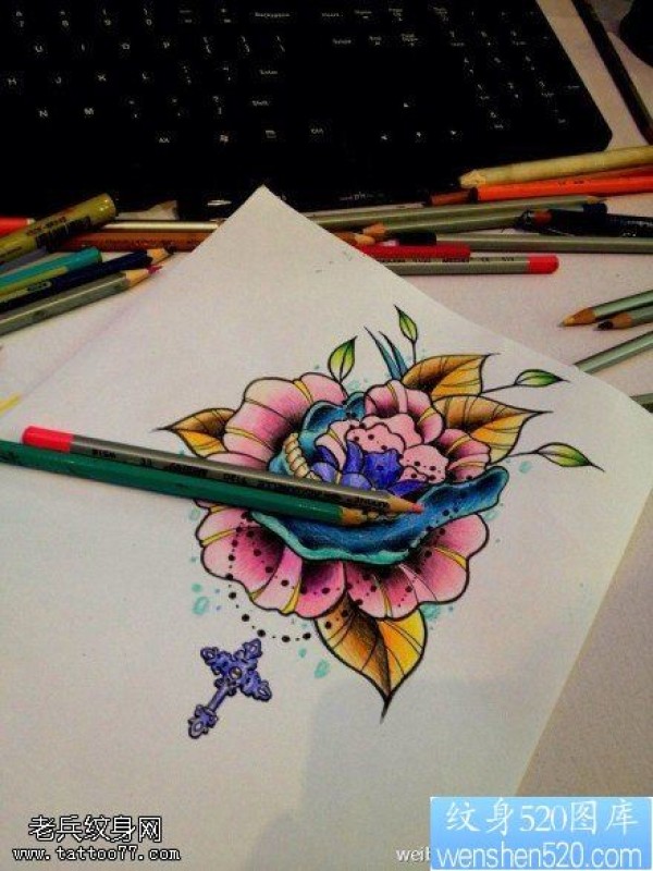 彩色玫瑰花十字架纹身图案_十字架纹身图案大全_纹身图吧