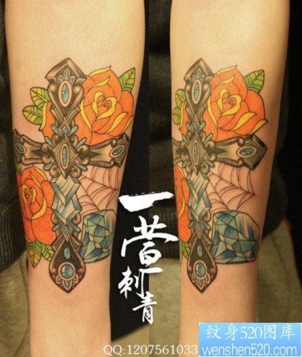 女人手臂精美的十字架钻石纹身图片_十字架纹身图案大全_纹身图吧