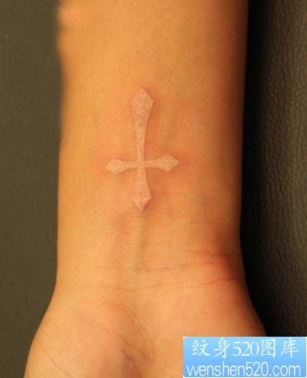 女人手腕处一幅白色图腾十字架纹身图片_十字架纹身图案大全_纹身图吧