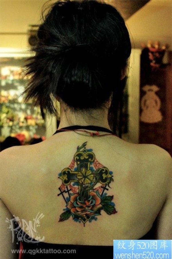 女人背部潮流好看的十字架纹身图片_十字架纹身图案大全_纹身图吧