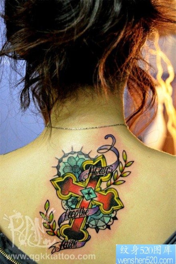 女人背部潮流精美的十字架纹身图片_十字架纹身图案大全_纹身图吧
