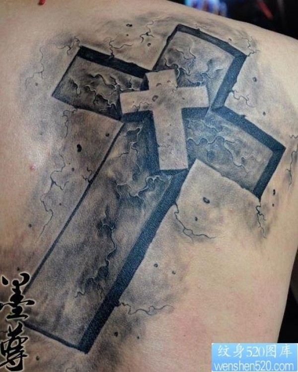 背部烙印地裂十字架纹身图片_十字架纹身图案大全_纹身图吧