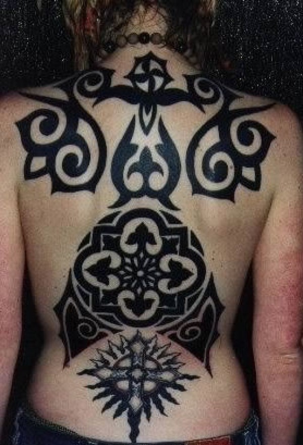后背大面积红色图腾纹身图带十字架黑色图腾纹_十字架纹身图案大全_纹身图吧