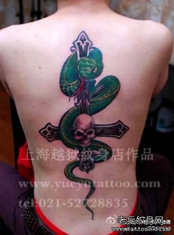 男生后背时尚帅气的蛇与十字架纹身图案_十字架纹身图案大全_纹身图吧