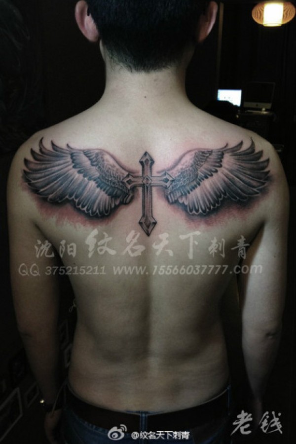 后背很酷经典的翅膀十字架纹身图案_十字架纹身图案大全_纹身图吧