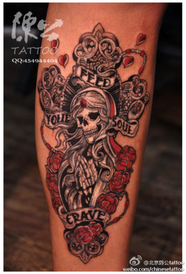 腿部潮流很酷的十字架与骷髅纹身图案_十字架纹身图案大全_纹身图吧