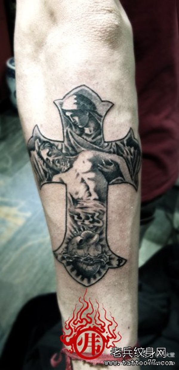 手臂一款经典的十字架耶稣圣母纹身图案_十字架纹身图案大全_纹身图吧