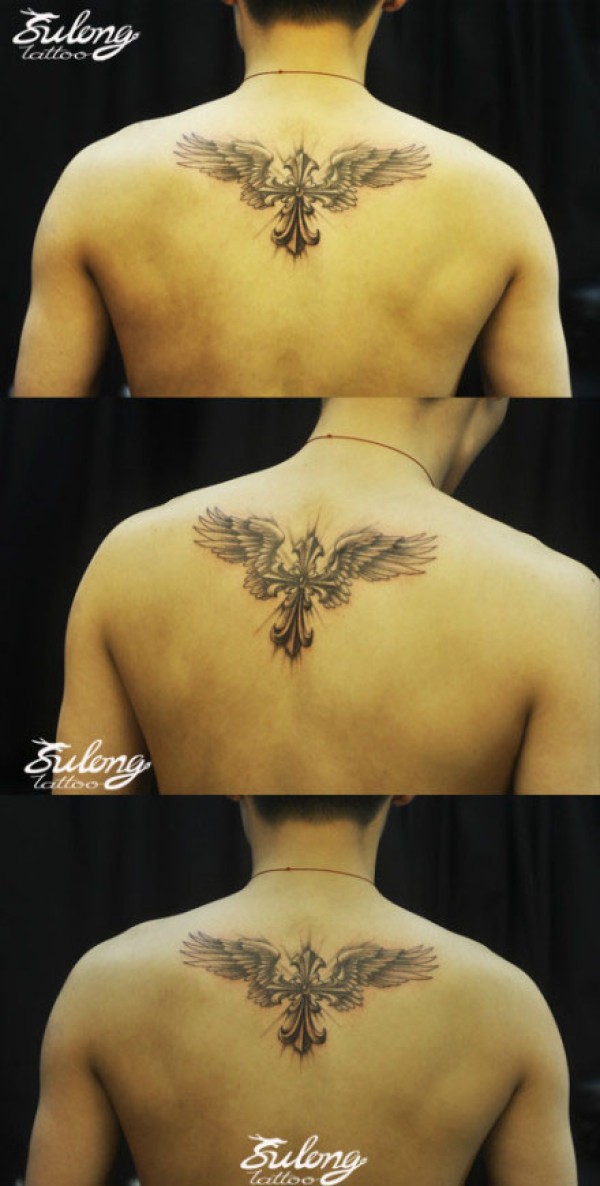 后背经典潮流的十字架翅膀纹身图案_十字架纹身图案大全_纹身图吧