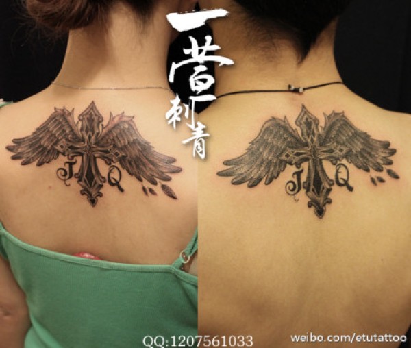 女生背部时尚流行的十字架翅膀纹身图案_十字架纹身图案大全_纹身图吧