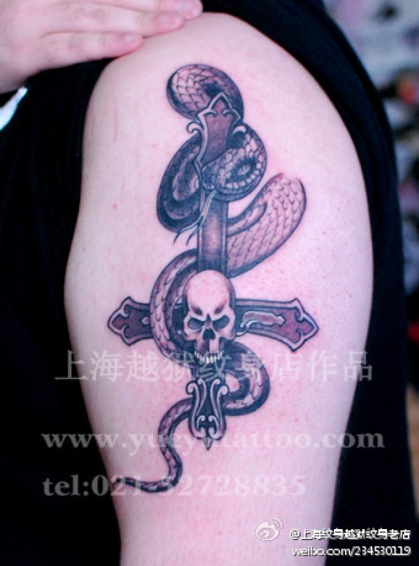 手臂帅气的十字架与蛇纹身图案_十字架纹身图案大全_纹身图吧