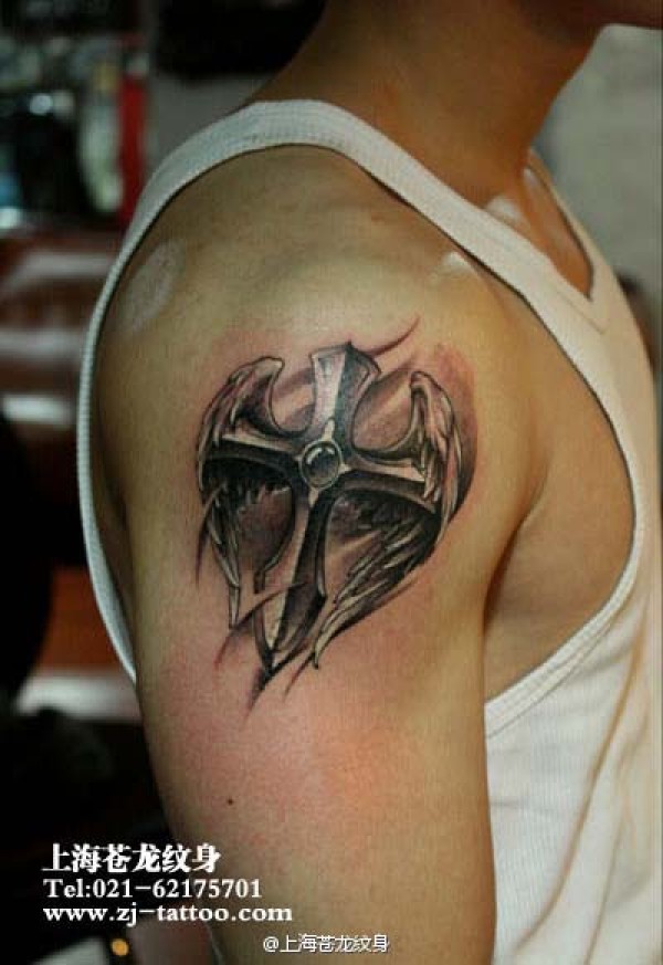 男人手臂时尚流行的十字架翅膀纹身图案_十字架纹身图案大全_纹身图吧