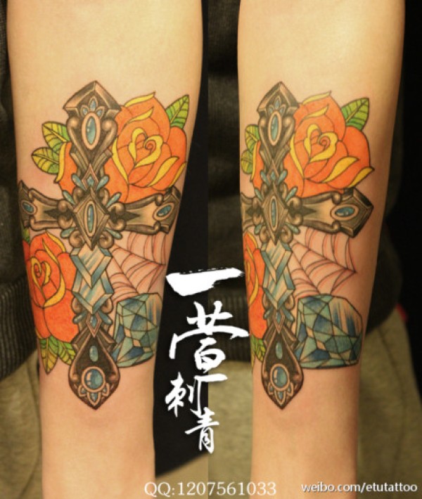 女生手臂时尚精美的十字架玫瑰花与钻石纹身图_十字架纹身图案大全_纹身图吧