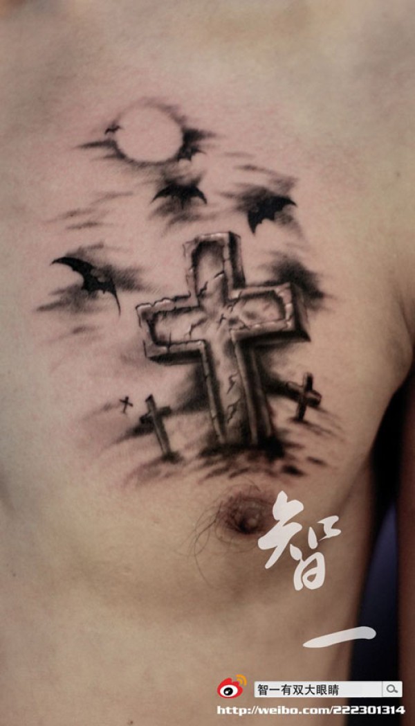 男人前胸时尚经典的十字架纹身图案_十字架纹身图案大全_纹身图吧