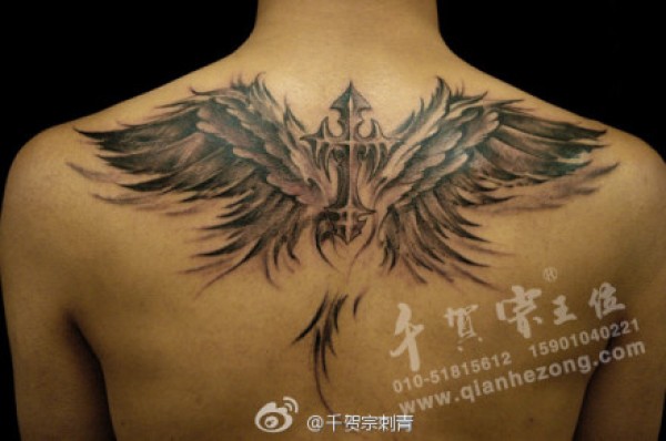 男人后背时尚经典的十字架翅膀纹身图案_十字架纹身图案大全_纹身图吧