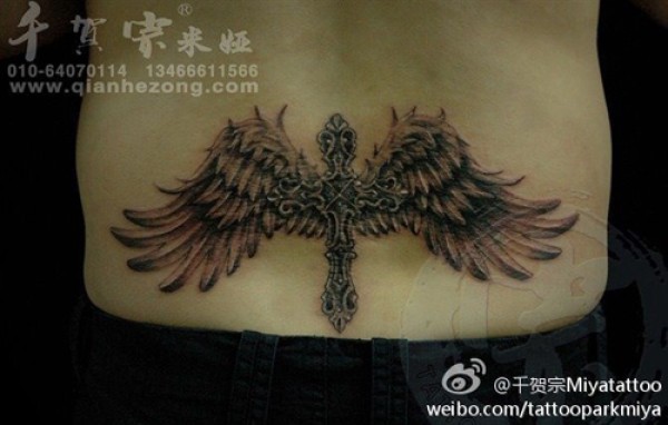 腰部经典好看的黑白十字架翅膀纹身图案_十字架纹身图案大全_纹身图吧