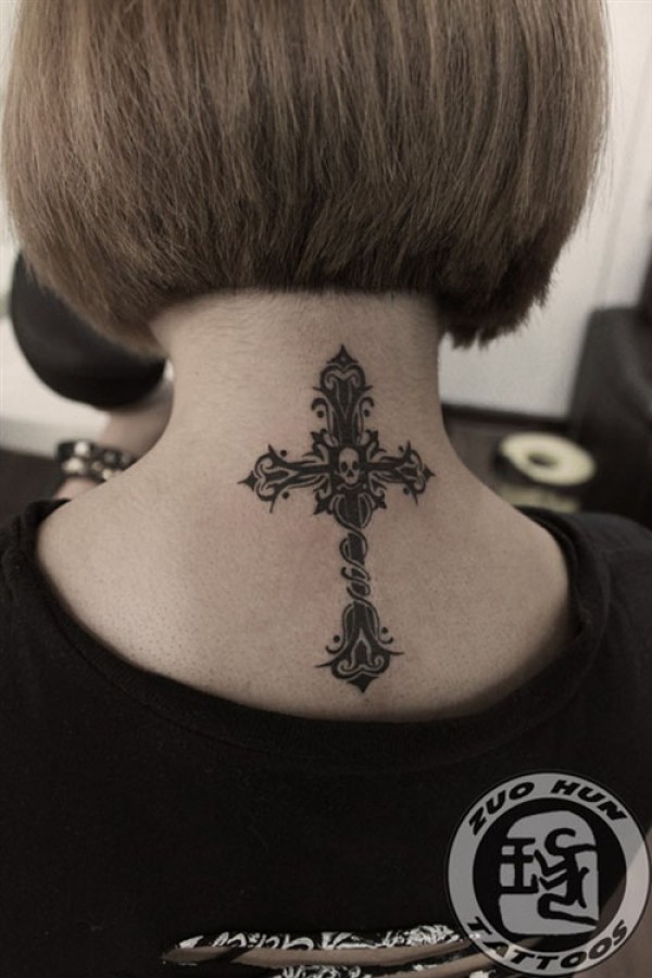 女生颈部精美的图腾十字架纹身图案_十字架纹身图案大全_纹身图吧