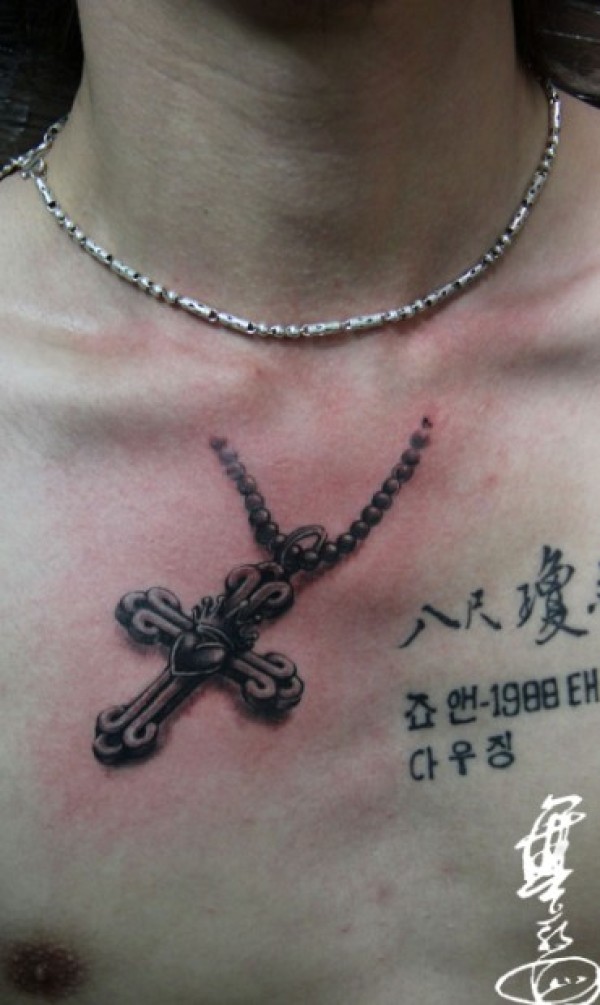 胸部精美的十字架项链纹身图案_十字架纹身图案大全_纹身图吧