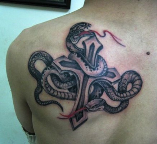 肩背帅气的十字架蛇纹身图案_十字架纹身图案大全_纹身图吧