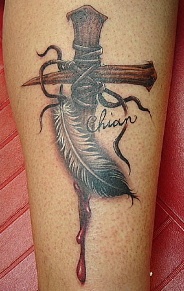 武汉纹身腿部十字架羽毛纹身图案图片_十字架纹身图案大全_纹身图吧