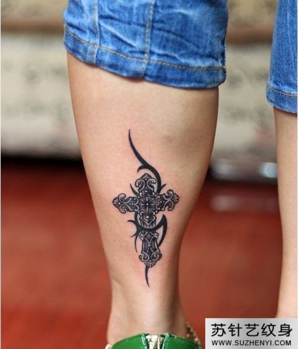 小腿复古时尚十字架纹身_十字架纹身图案大全_纹身图吧