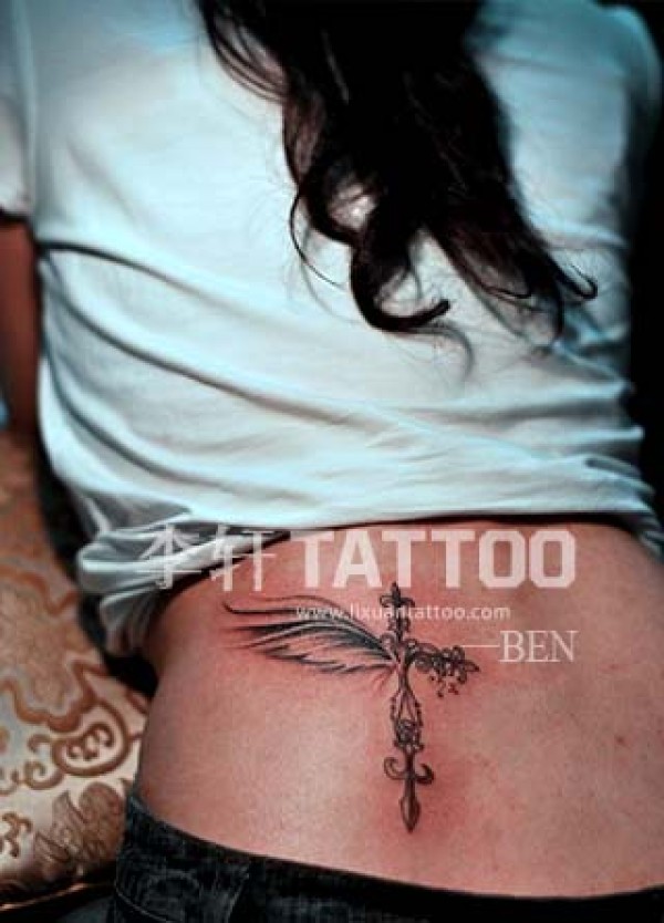女生背部时尚流行的十字架翅膀纹身图案_十字架纹身图案大全_纹身图吧
