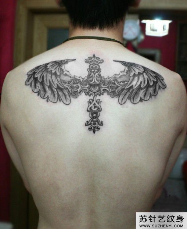 唯美精致十字架翅膀后背纹身_十字架纹身图案大全_纹身图吧