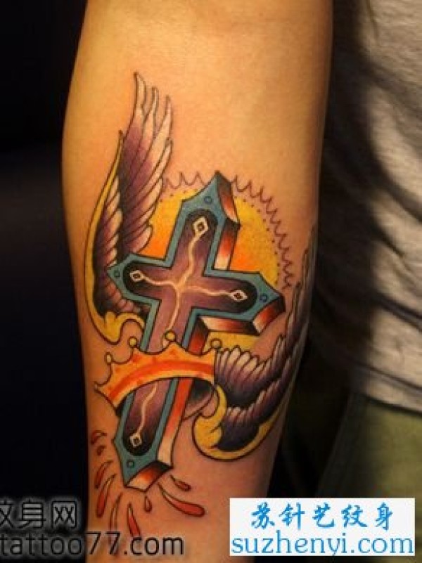 手臂彩色十字架翅膀纹身图案_十字架纹身图案大全_纹身图吧