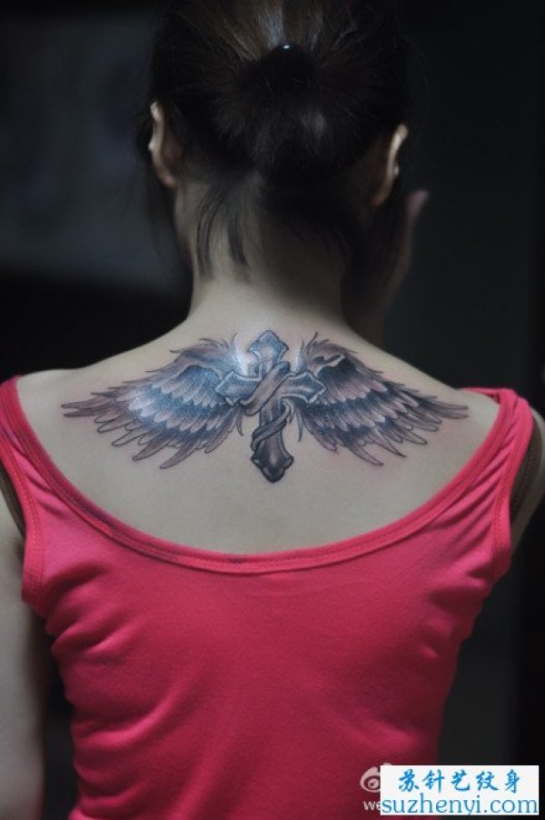 女生背部时尚流行的十字架翅膀纹身图案_十字架纹身图案大全_纹身图吧
