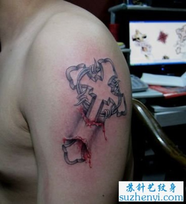 一款扎进皮肤的十字架纹身图案_十字架纹身图案大全_纹身图吧