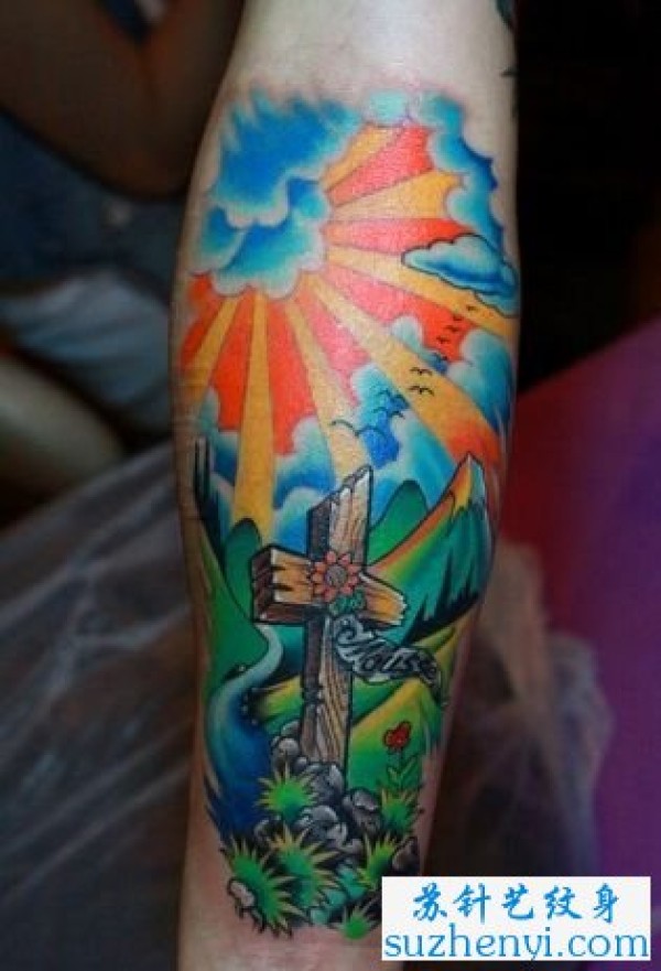 艳丽的彩色十字架纹身_十字架纹身图案大全_纹身图吧