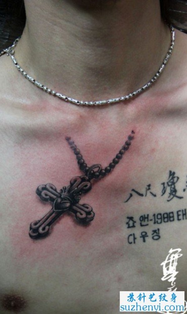 前胸十字架项链纹身_十字架纹身图案大全_纹身图吧